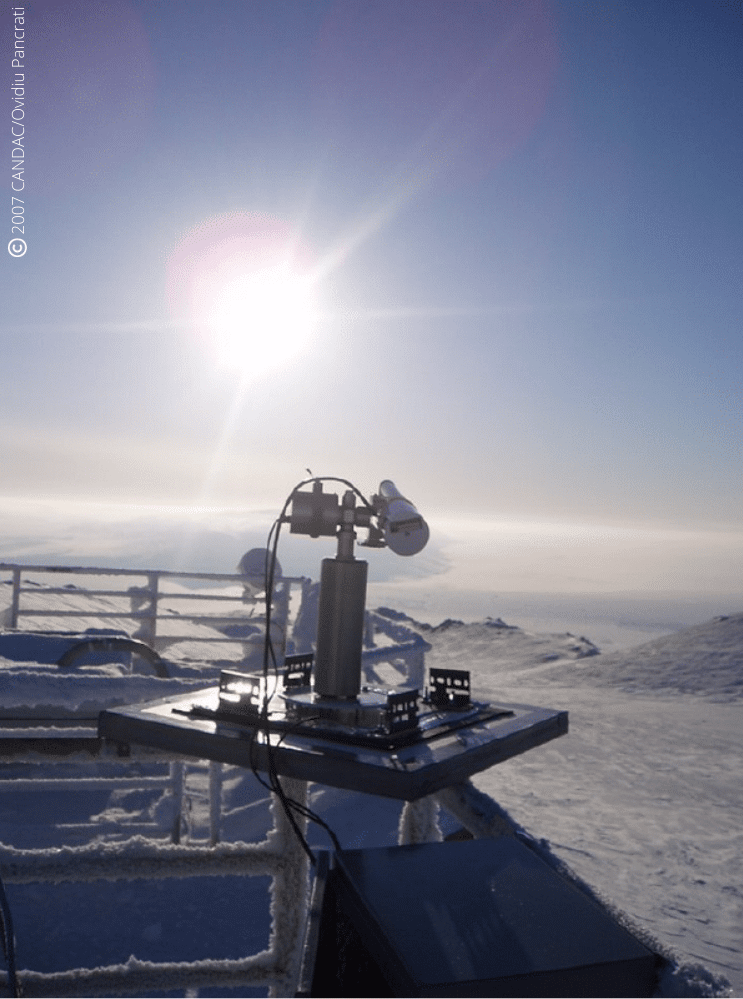 Adapted CIMEL CE 318‑T photometer installed on the vessel, stabilized against motion and protected from spray